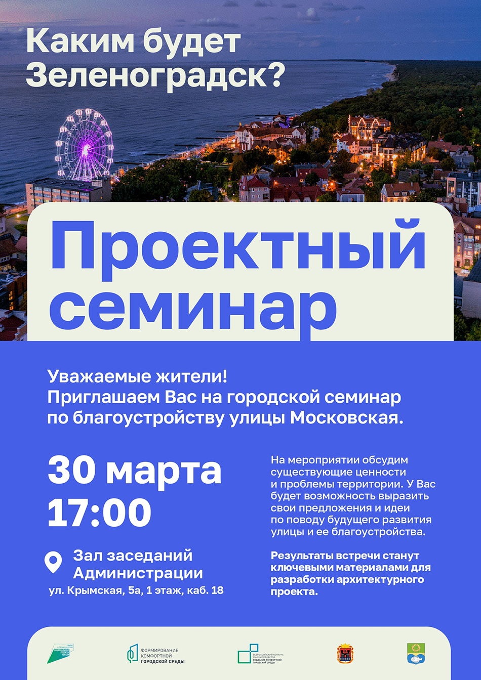 Уважаемые жители Зеленоградска, приглашаем вас на городской семинар соучаствующего проектирования по благоустройству улицы Московской.