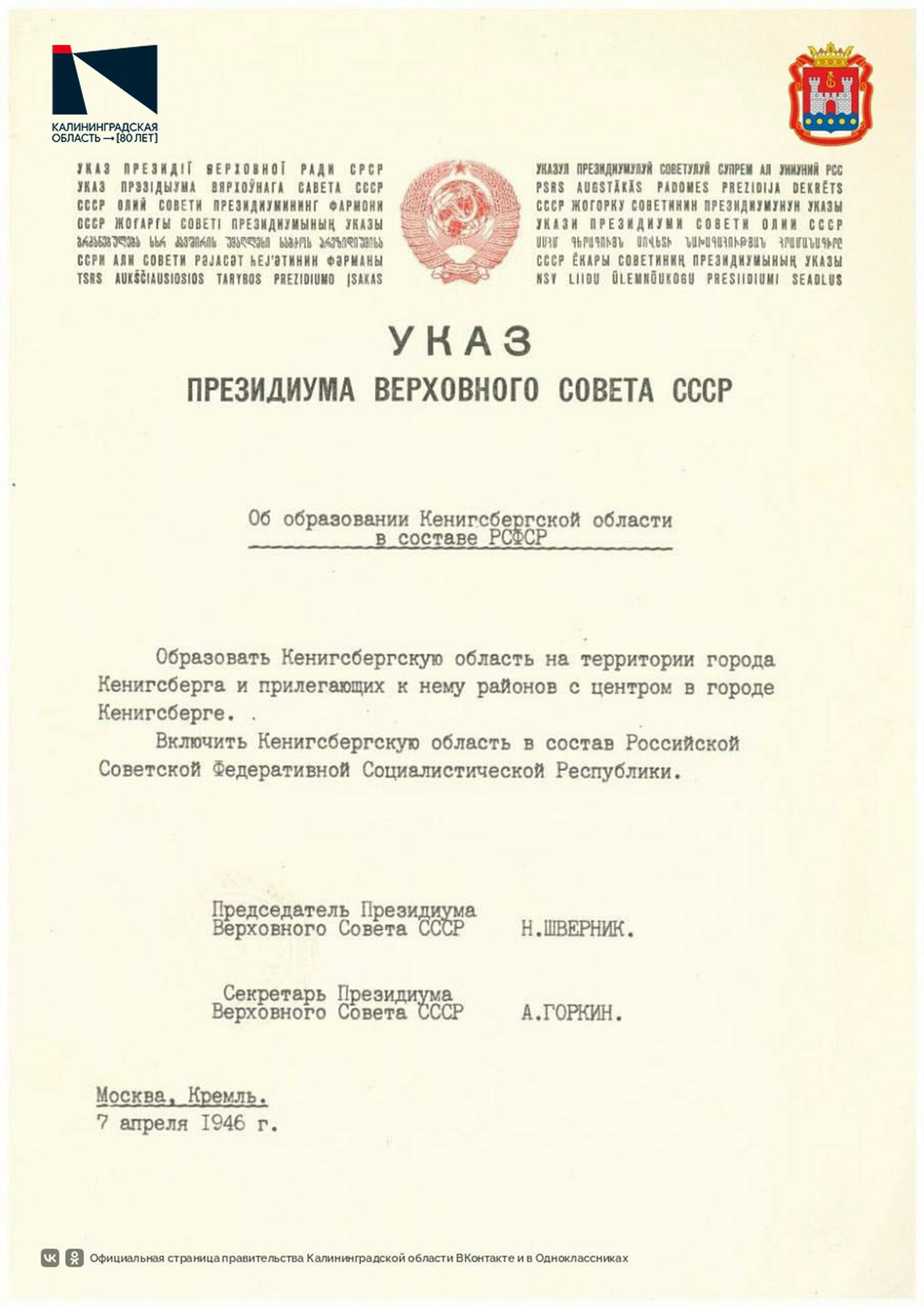 7 апреля 1946 года в составе РСФСР образовали Кёнигсбергскую область. В июле того же года её переименуют в Калининградскую.