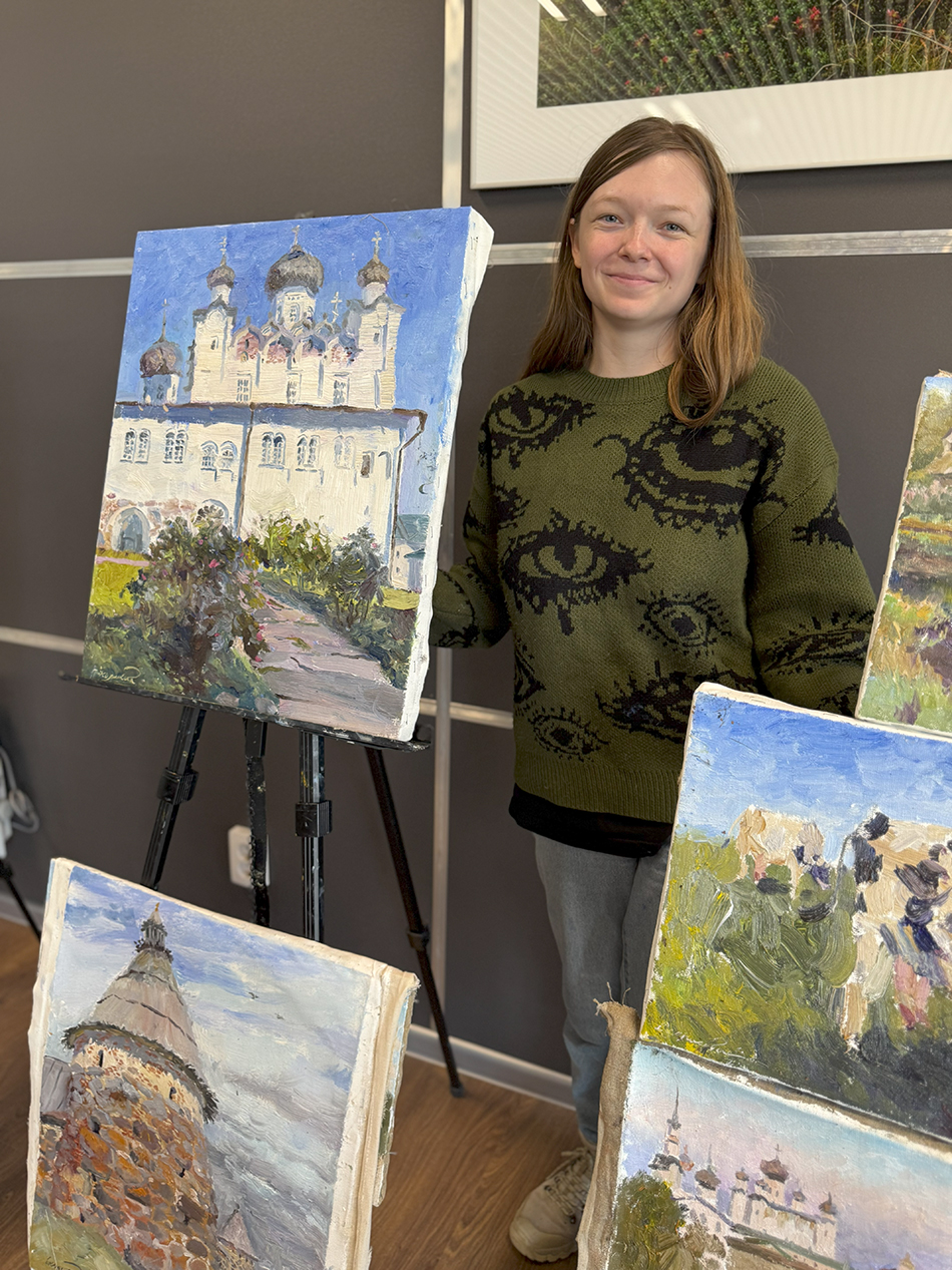 – Я на Соловках впервые, и, конечно, здесь очень живописные места. Белое море поразило меня своей необычностью. Ну и монастырь, конечно, со своими потрясающими фактурными стенами. Крым – это вообще иная палитра. Конечно, я бы с удовольствием поехала, пописа́ла горы, море. Это другие совсем цвета, другой колорит. Ведь говорят же, что художники едут на море в Крым, чтобы чистить палитру, потому что здесь, в северных регионах, более сложные, суровые оттенки.