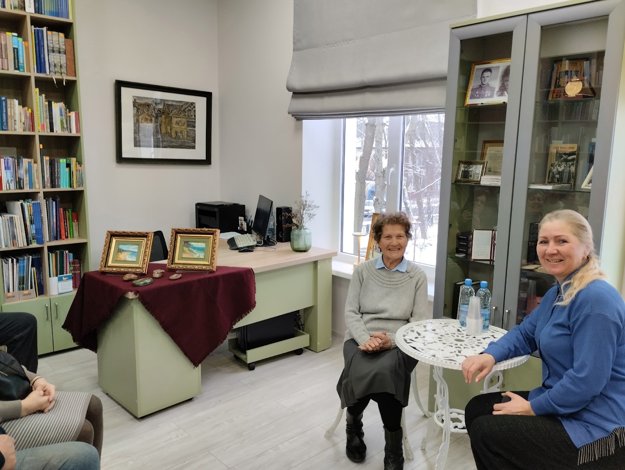 В ходе общения с гостями библиотеки Татьяна и Мария рассказали о себе, о том, как создают свои работы, о своей дружбе. Особенно трогательно прозвучал рассказ Татьяны Шестак о том, как много лет назад она нарисовала на морских камнях несколько портретов Юрия Куранова и до сих пор они занимают почетное место в литературно-музейной гостиной.