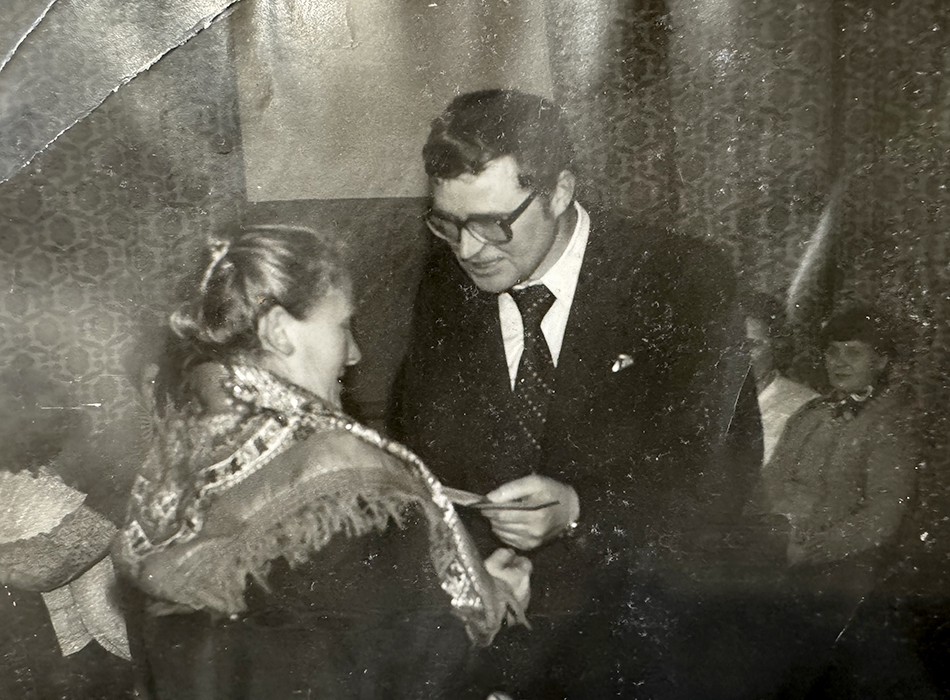 Иван Павлович Кацубо в торжественной обстановке поздравляет нашу героиню с присвоением звания «Ветеран труда»
