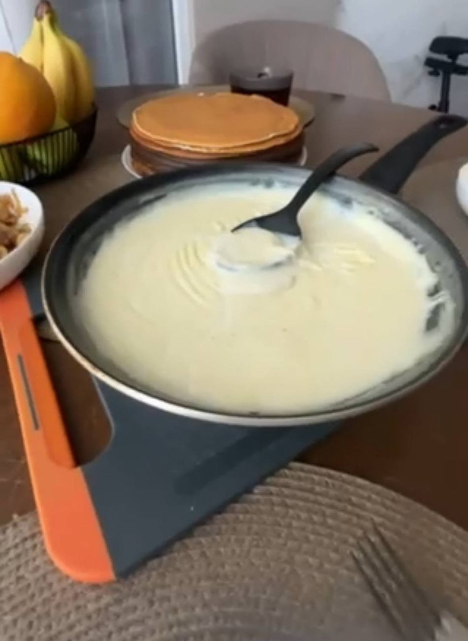 Блины для такой мачанки готовятся на сыворотке – за счёт повышенной кислотности они получаются очень пышными. Кефир перетапливается на медленном огне, расслаивается – получившаяся жидкость и есть сыворотка.