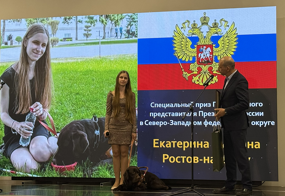 Одна из самых престижных наград премии – приз Полномочного представителя Президента России в СЗФО - вручен незрячей студентке из Ростова-на-Дону Екатерине Кудриной, создавшей ряд уникальных проектов, которые помогают слабовидящим людям взаимодействовать с собаками-поводырями.