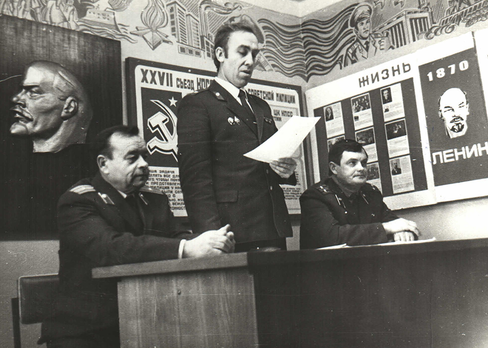 Постановка задачи личному составу перед обеспечением порядка на митинге 7 ноября 1986 года. Замполит Борис Алексеевич Павздерин, начальник РОВД Владимир Антонович Козарь и начальник РОУКГБ Борис Ефимович Ливенков