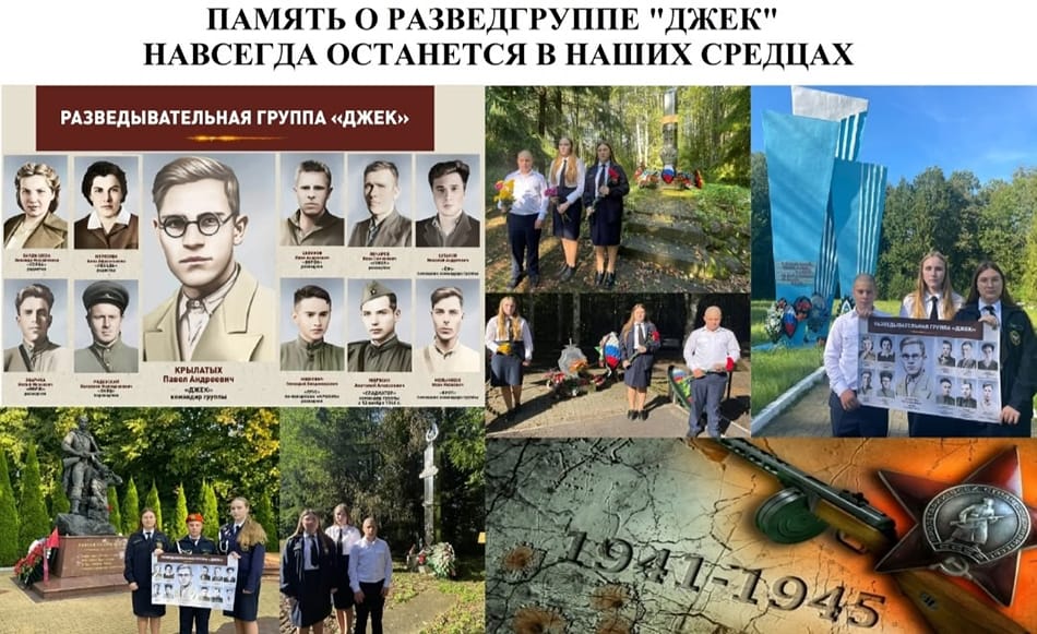 Школьники приняли участие во всероссийском конкурсе «Карта доблести России»: это часть большого образовательно-просветительского проекта по сохранению памяти о героях, защищавших и защищающих нашу страну. Проектную работу «Первые в тылу врага: по следам разведгруппы «Джек» кадеты 8а класса Альбина Кондраченко, Артём Мозин и Варвара Подкорытова выполнили под руководством педагога-наставника Ольги Трофимовны Валеулиной.