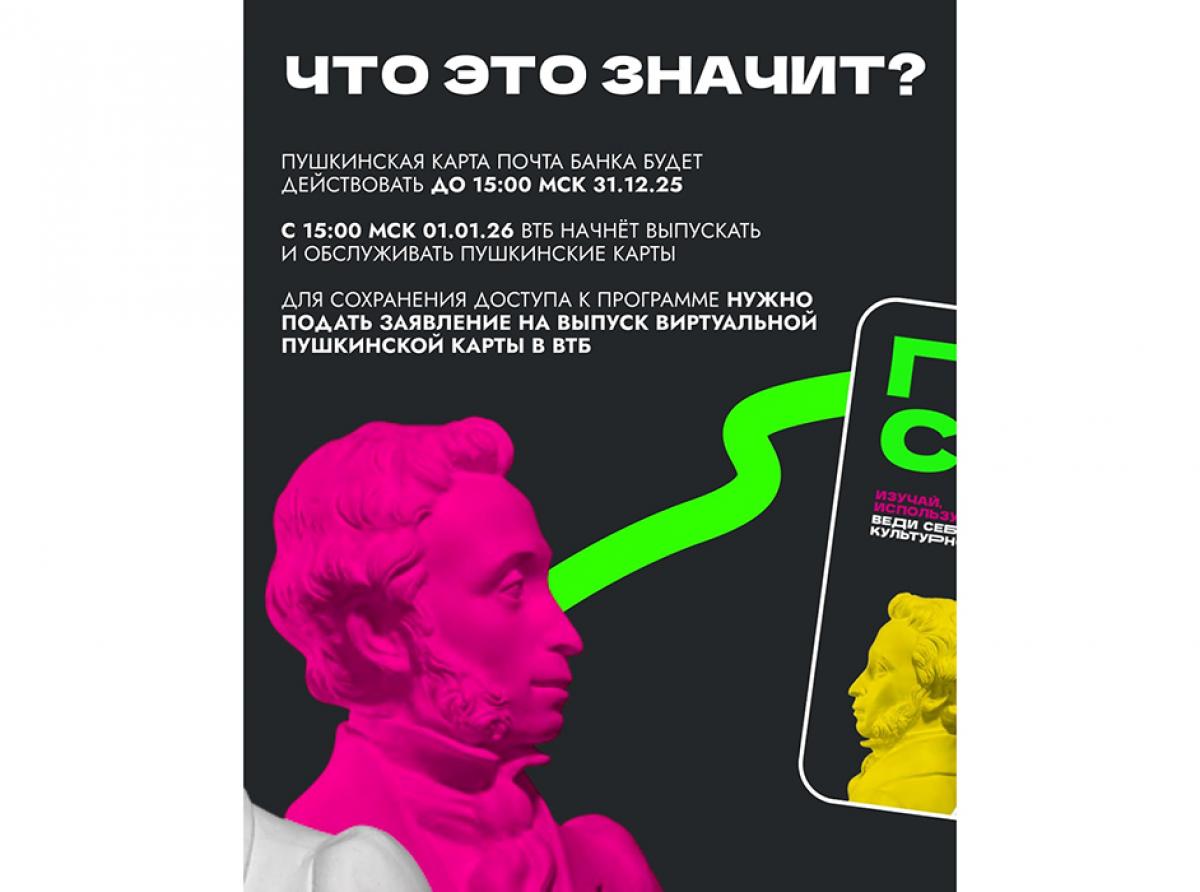 С 2026 года оператором программы станет ВТБ. Для того чтобы продолжать покупать билеты в театры, музеи, кино и на концерты по Пушкинской карте, уже сейчас можно подать заявление на перевыпуск карты онлайн или в отделении банков ВТБ и «Почта Банк».