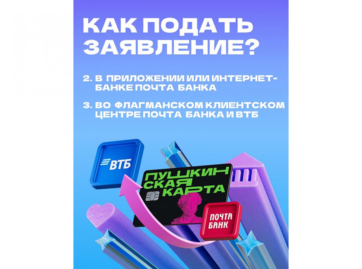 — заявление подаётся в приложениях «Госуслуги Культура», «Почта Банк», а также во флагманских клиентских центрах ВТБ и «Почта Банк»;