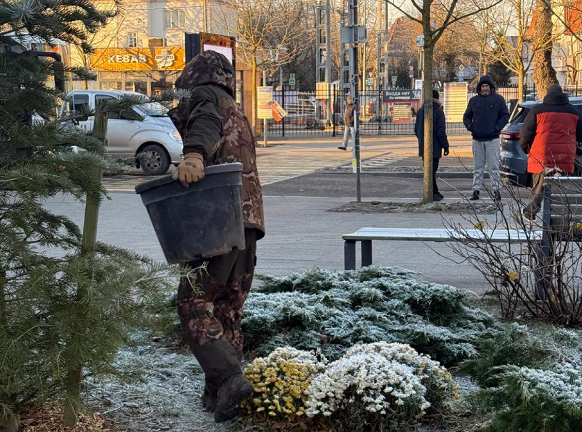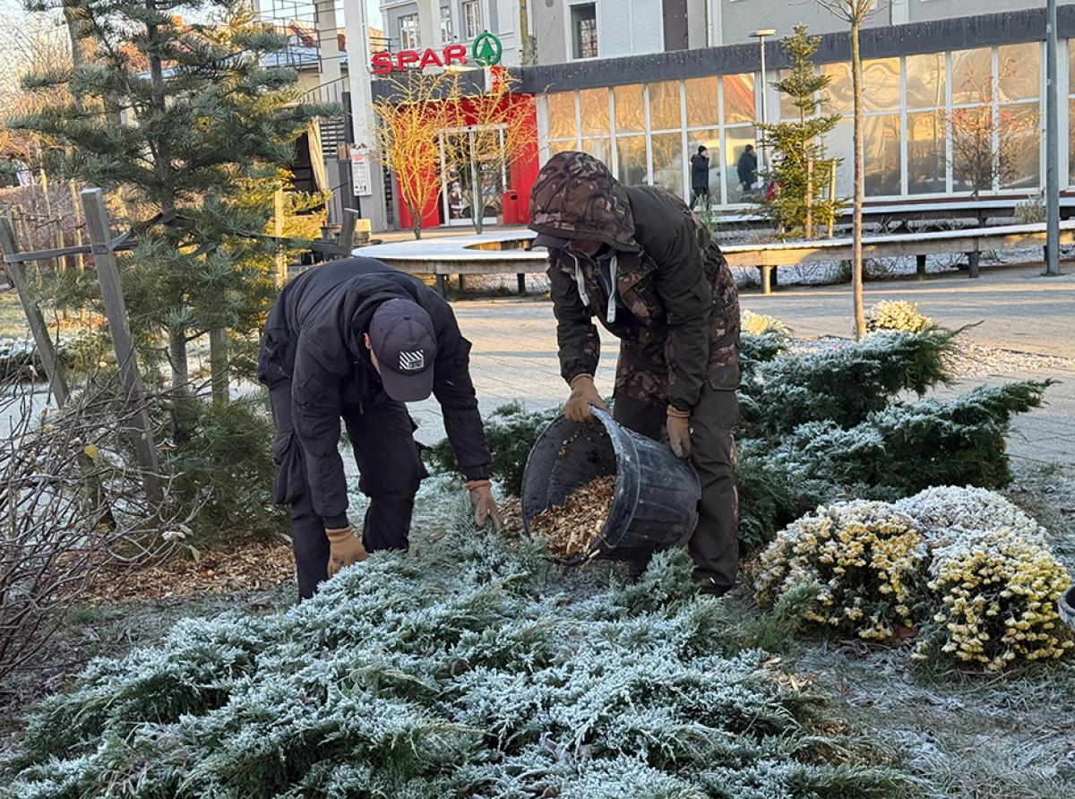 Сотрудники МАУ «Озеленитель» обновляют слой мульчи на приствольных кругах уже растущих деревьев и кустарников