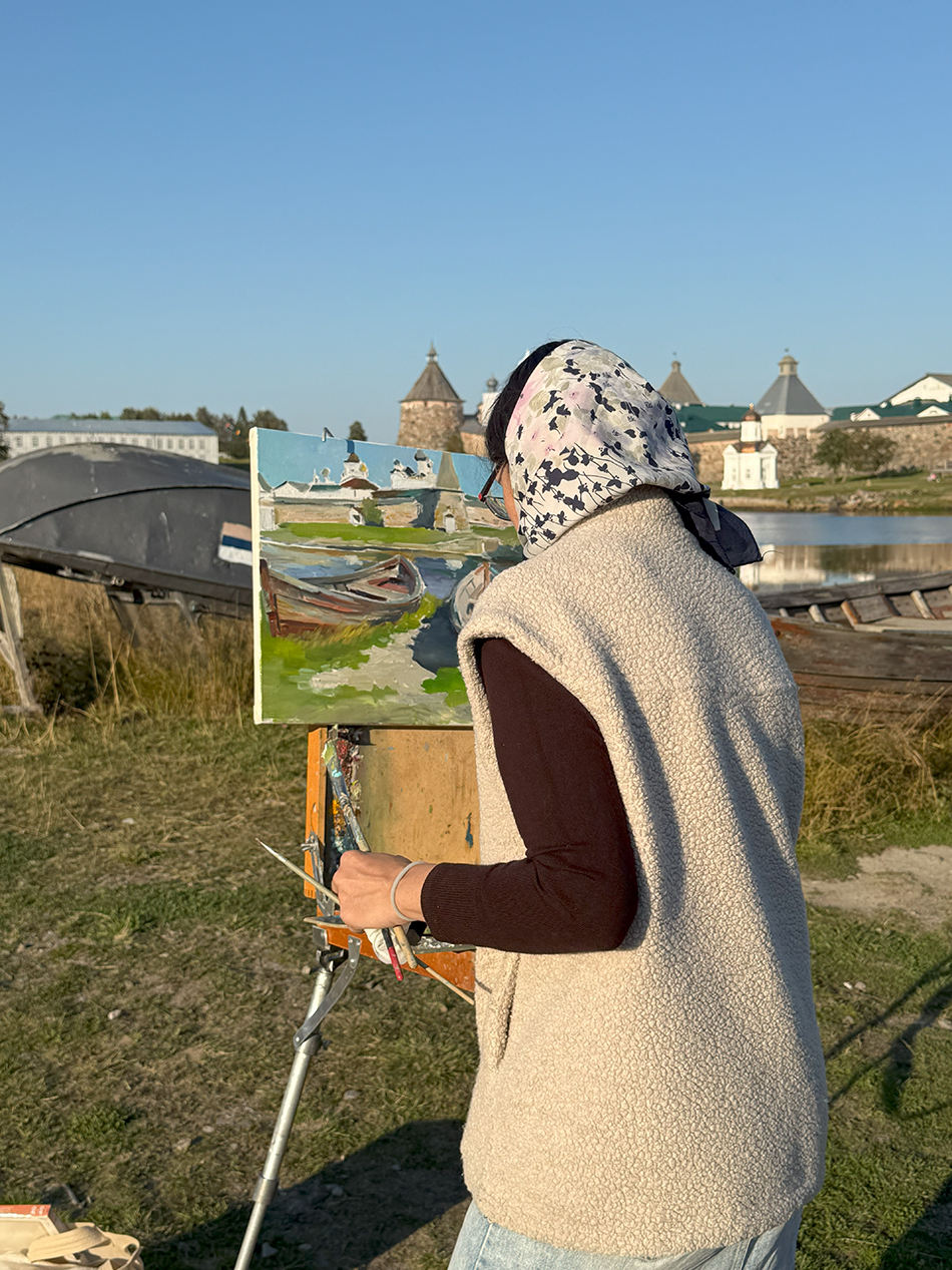 – Я на Соловках впервые, и, конечно, здесь очень живописные места. Белое море поразило меня своей необычностью. Ну и монастырь, конечно, со своими потрясающими фактурными стенами. Крым – это вообще иная палитра. Конечно, я бы с удовольствием поехала, пописа́ла горы, море. Это другие совсем цвета, другой колорит. Ведь говорят же, что художники едут на море в Крым, чтобы чистить палитру, потому что здесь, в северных регионах, более сложные, суровые оттенки.