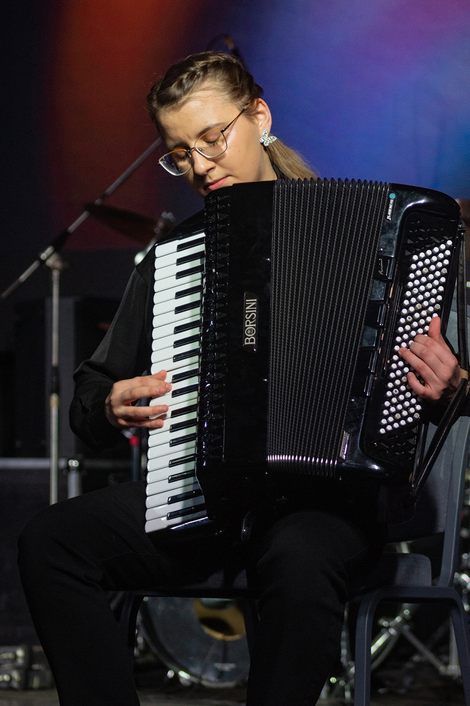 Настя выбрала для себя самобытный народный инструмент – аккордеон, она признаётся, что именно аккордеон сочетает в себе звучание и тембры разных инструментов, благодаря чему игра на нём никогда не надоедает.