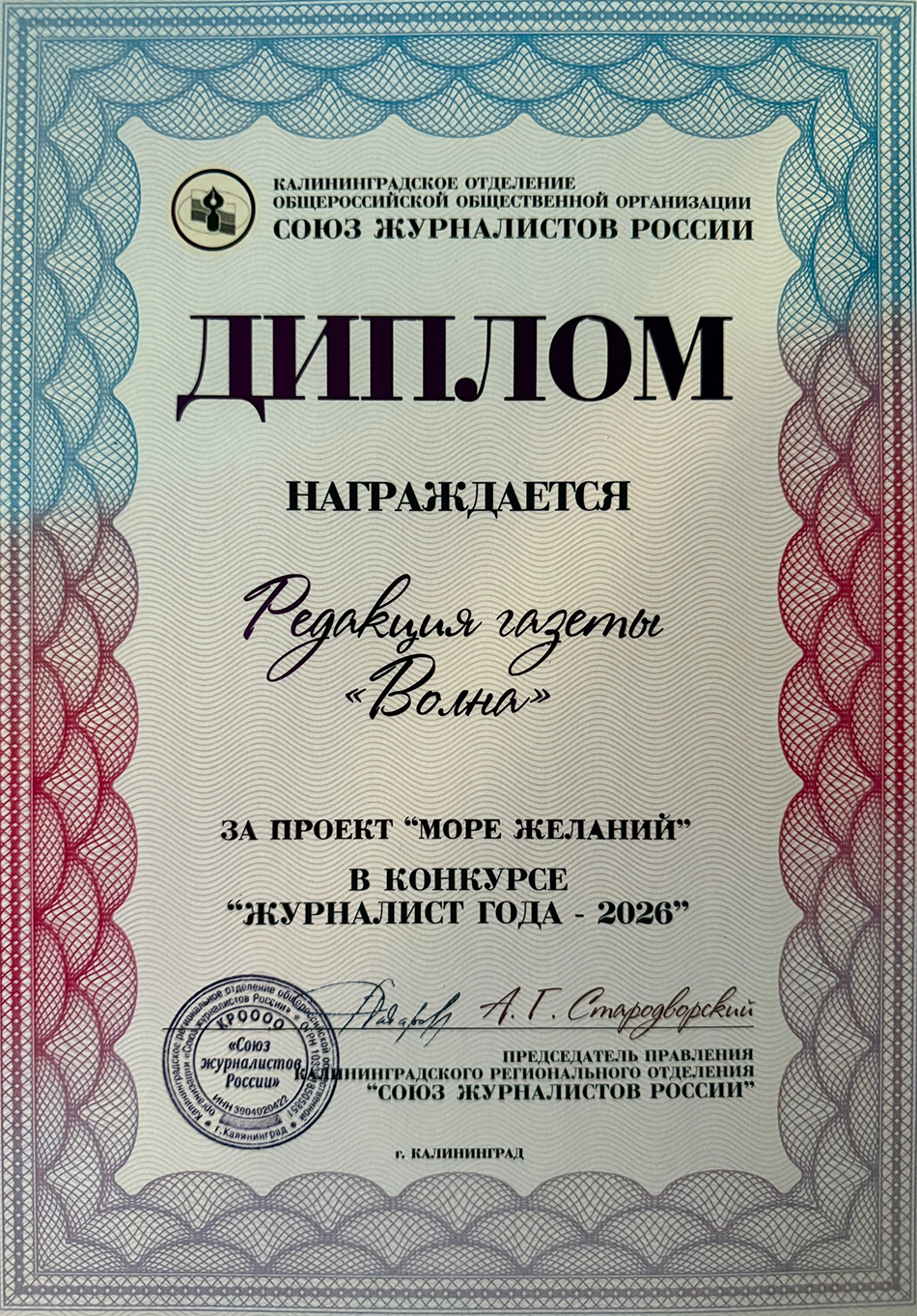 Главный редактор Татьяна Нечаева награждена Благодарственным письмом губернатора за значительный вклад в развитие средств массовой информации Калининградской области.