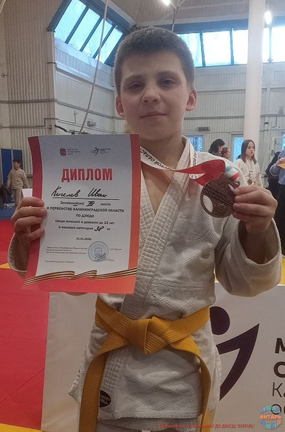 Иван Киселёв, воспитанник спортшколы «Янтарь» и тренеров-преподавателей Валерия и Алевтины Шалимовых, стал бронзовым призёром Первенства области по дзюдо среди мальчиков и девочек до 13 лет.