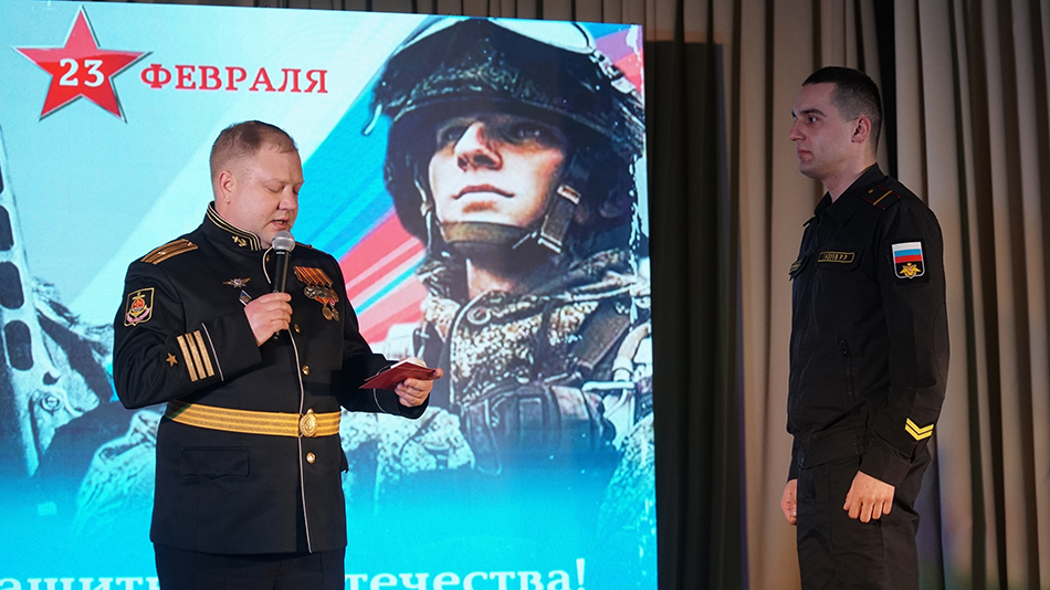 На открытии торжественного собрания начальник штаба войсковой части 53168-А капитан 3 ранга Ярослав Валерьевич Панков поздравил всех присутствующих и зачитал поздравительное обращение командующего Балтийским флотом адмирала Сергея Липилина.